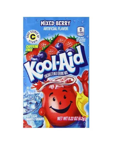 Il sapore Mixed Berry di Kool-Aid non è altro che una miscela fruttata di frutti di bosco: fragole e mirtilli . I pacchetti di polvere Kool-Aid sono una fonte di vitamina C e sono privi di caffeina. Tutte le polveri Kool-Aid sono senza zucchero . Puoi utilizzarlo per diverse bevande, sia come bevanda rinfrescante che come accompagnamento per i tuoi cocktail.
