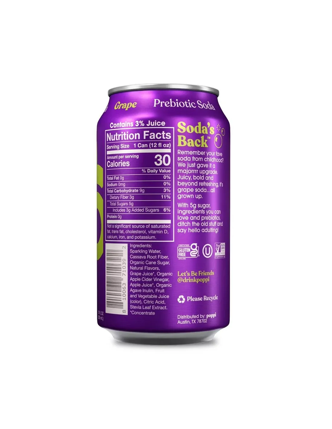 La Poppi Prebiotic Grape Soda reinventa l'iconico sapore d'uva delle bibite americane con un approccio più leggero e pulito, arricchito con prebiotici naturali . A differenza delle classiche bibite all'uva, spesso molto dolci, Poppi offre una versione moderna, frizzante ed equilibrata, perfetta per chi ama le bevande fruttate ma desidera un'alternativa più sana.