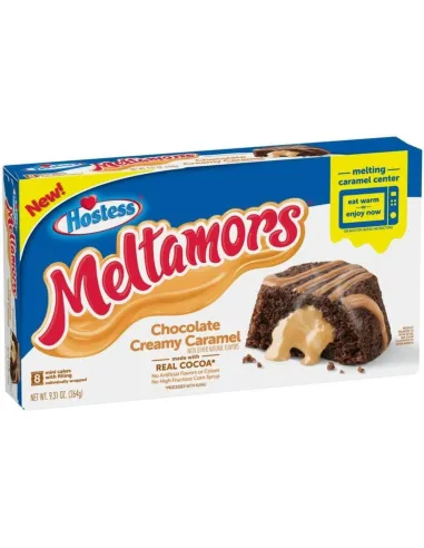 Hostess Meltamors Chocolate Creamy Caramel sono mini tortine americane con una soffice base al cioccolato e un cuore di caramello cremoso . Bastano 5 secondi nel microonde per trasformare questo snack in un dessert da ristorante con un cuore deliziosamente fuso.