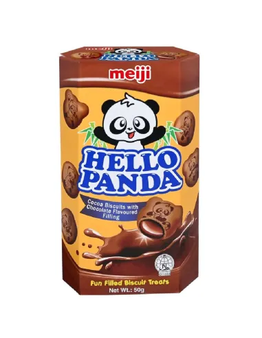 È ora di uno spuntino con i biscotti Hello Panda Double Chocolate . Deliziosi biscotti di pasta frolla con ripieno di crema al cioccolato, a forma di panda. I biscotti Hello Panda sono tra i dolcetti più popolari in Giappone, un vero bestseller.
