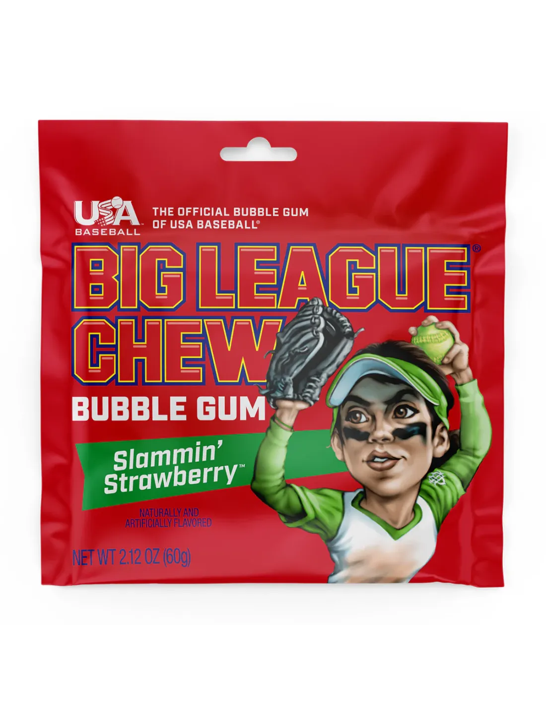 Un sacchetto di gomma da masticare che può essere tagliato a piacere sotto forma di piccoli fili e che ha la capacità di mantenere il gusto e la durata di essere masticato per tutta la durata di una partita di Baseball. Divenuta il riferimento per tutti i giocatori della MLB , questa versione di Big League Chew Blue ha un buon gusto di fragola .