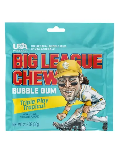 Un sacchetto di gomma da masticare che può essere tagliato in piccoli fili a piacere e che ha la capacità di mantenere il suo sapore e la durata della masticazione per tutta la partita di baseball. Divenuta il punto di riferimento per tutti i giocatori della MLB , questa versione di Big League Chew Bubble Gum Triple Play Tropical ha un fantastico sapore tropicale.
