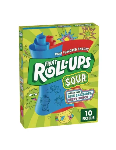Scopri le caramelle Fruit Roll-Ups Sour Blue Raspberry e Berry Punch . Caramelle roll-up del marchio General Mills al gusto di lampone blu e mirtillo punch. Sono vendute in confezioni da 10.