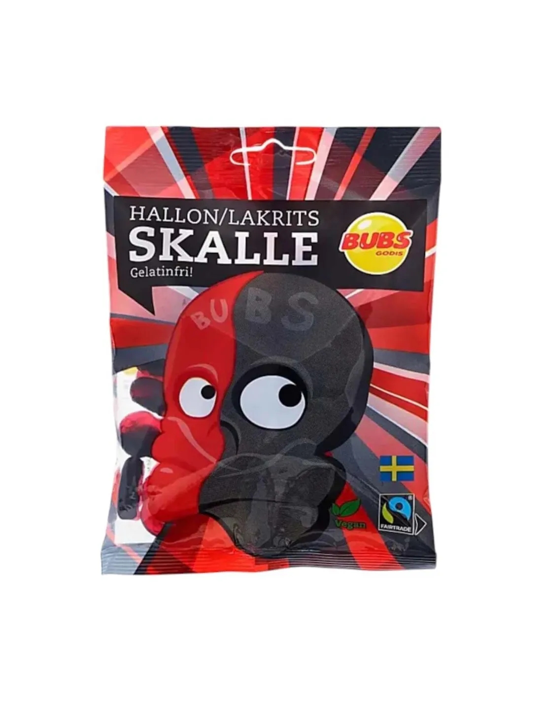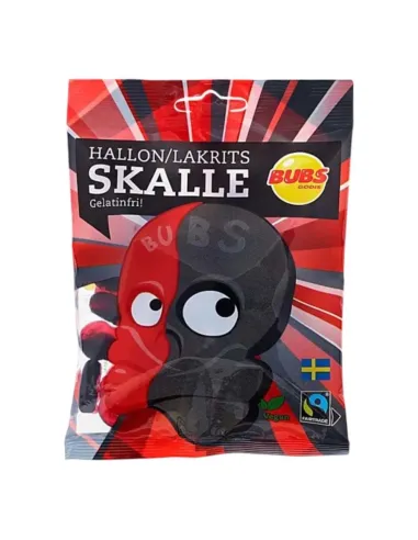 Sei un amante dei dolciumi? Allora è il momento di coccolarti con la bustina di caramelle Bubs Hallon Lakrits Skalle . Adorerai queste caramelle a forma di teschio, con il loro delizioso sapore di lampone e liquirizia. Sono senza gelatina e adatte a tutti i vegetariani e vegani.
