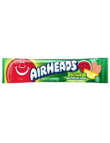 Una caramella a forma di piccola striscia, simile alle caramelle Carambar, con un delizioso sapore di anguria. Le Airheads sono disponibili in diversi gusti, ognuno straordinario grazie alla loro consistenza morbida e saporita. Le Airheads Bar Sour Watermelon Punch sono una novità sul mercato americano.