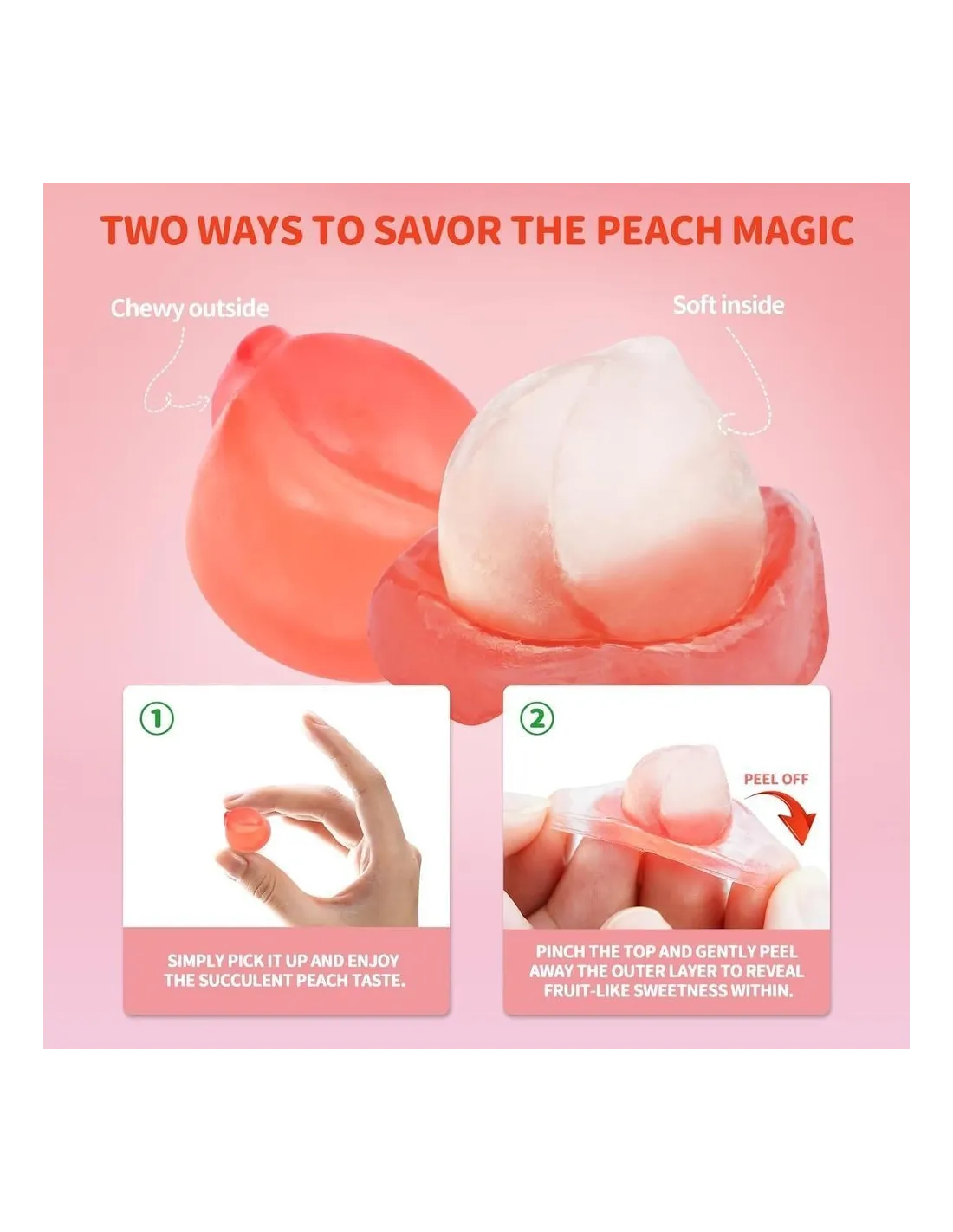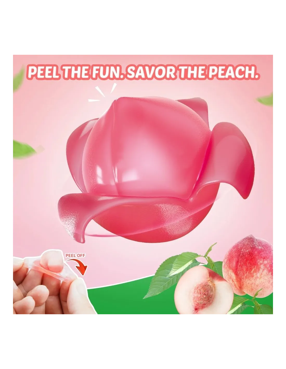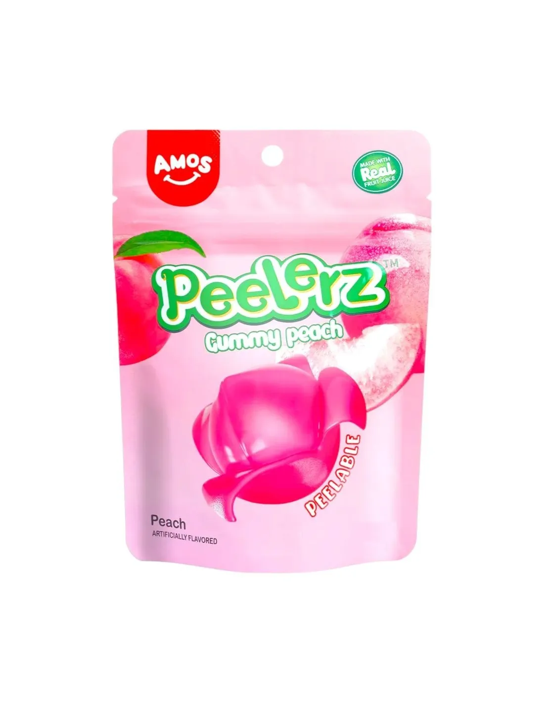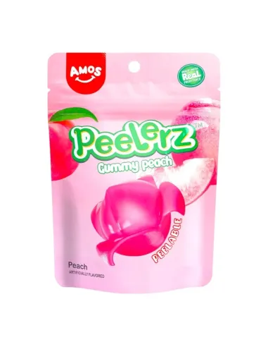 Le Amos Peelerz Gummy Peach sono caramelle gommose a forma di pesca che si possono sbucciare come un vero frutto . Realizzate con vero succo di pesca , offrono una doppia consistenza unica e un'esperienza di spuntino divertente e appagante, diventata virale su TikTok.