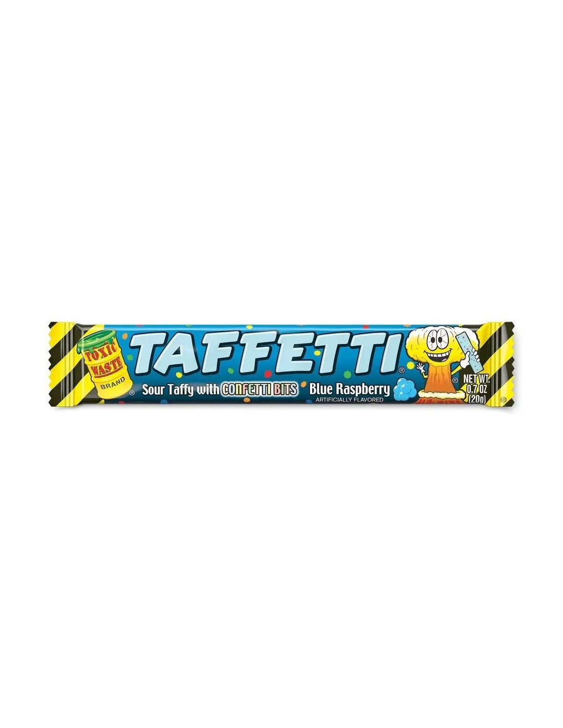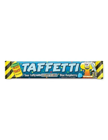 Toxic Waste Taffetti Blue Raspberry supera i confini delle caramelle aspre con un concetto innovativo: una caramella morbida ed elastica, arricchita con un intenso sapore acidulo di lampone blu , e arricchita con minuscoli coriandoli multicolori che scricchiolano in bocca. Il risultato è un'esperienza sensoriale unica, in cui ogni morso alterna la consistenza fondente della caramella classica a imprevedibili esplosioni croccanti.