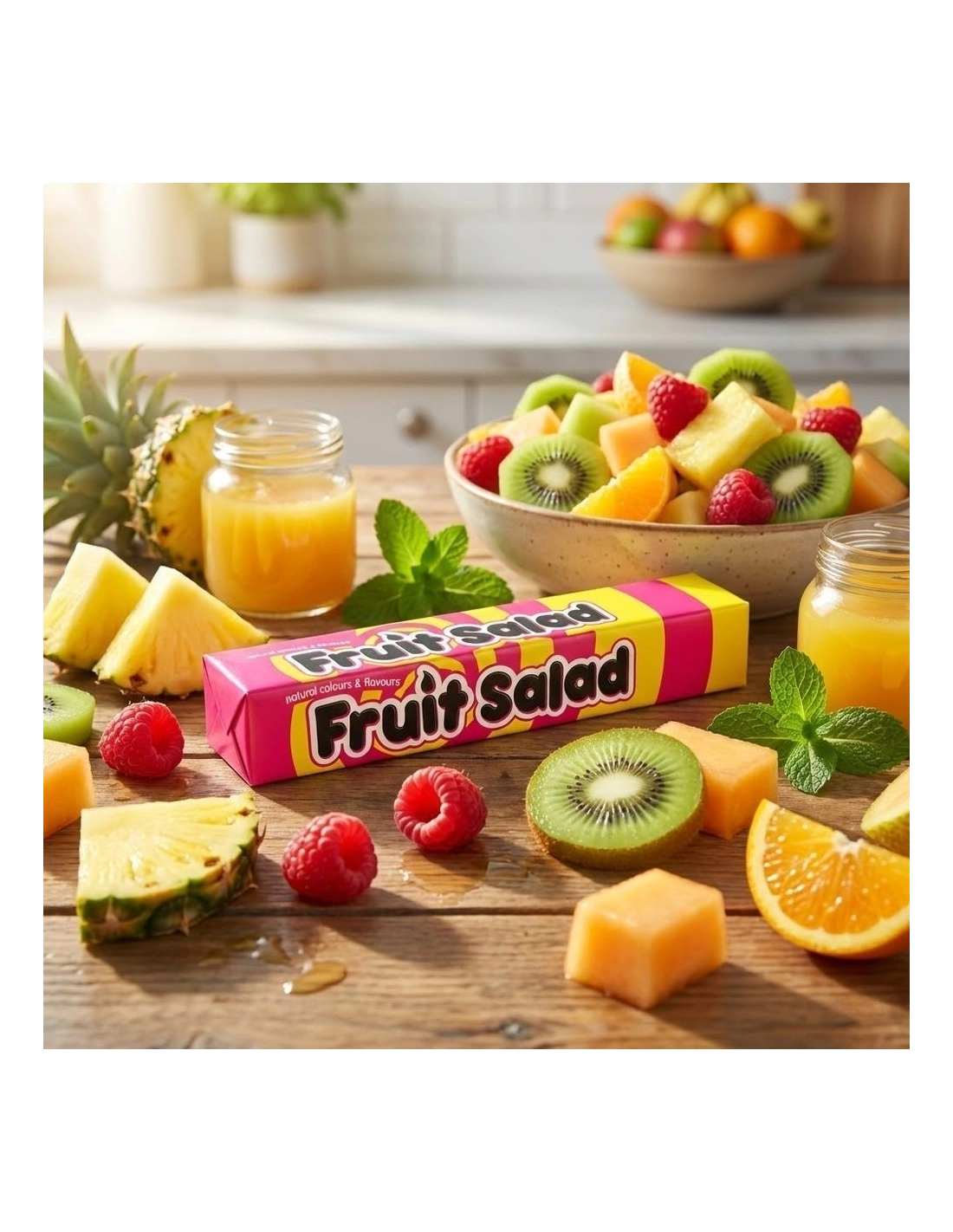 Le Barratt Fruit Salad Stick Pack sono una vera madeleine proustiana britannica . Queste piccole caramelle masticabili rettangolari offrono un sapore unico che fonde lampone aspro e ananas tropicale , creando un profilo gustativo fruttato e leggermente aspro che ha conquistato generazioni di britannici. Il loro caratteristico colore rosso-rosato è dovuto a coloranti naturali (antociani ed estratto di paprika).