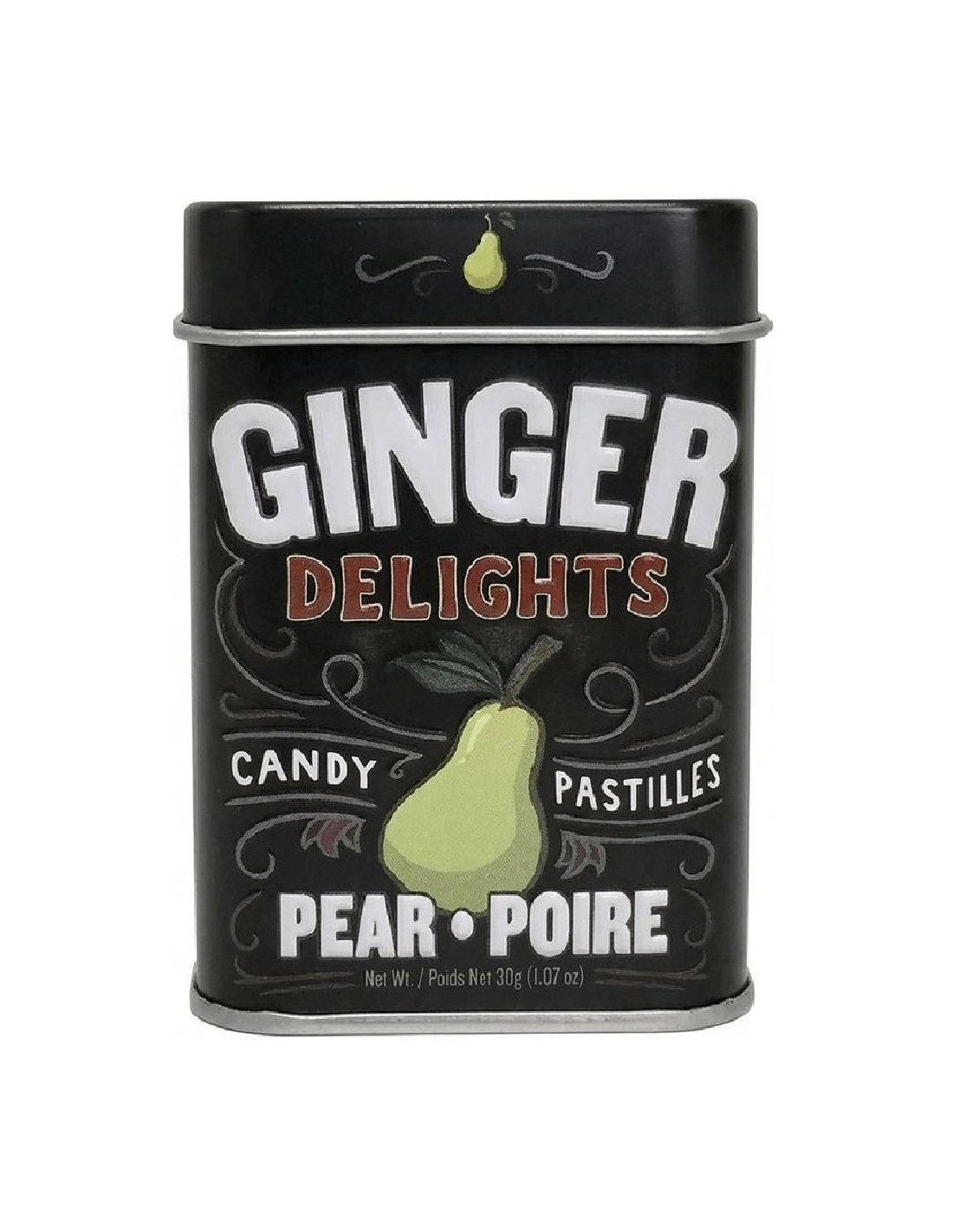 Con le caramelle Ginger Delights alla pera, il tuo palato farà un viaggio in Canada! Gusta queste pastiglie uniche, presentate in una splendida scatola di latta vintage, che offrono un perfetto equilibrio tra il sapore speziato del vero zenzero e la dolcezza fruttata della pera .