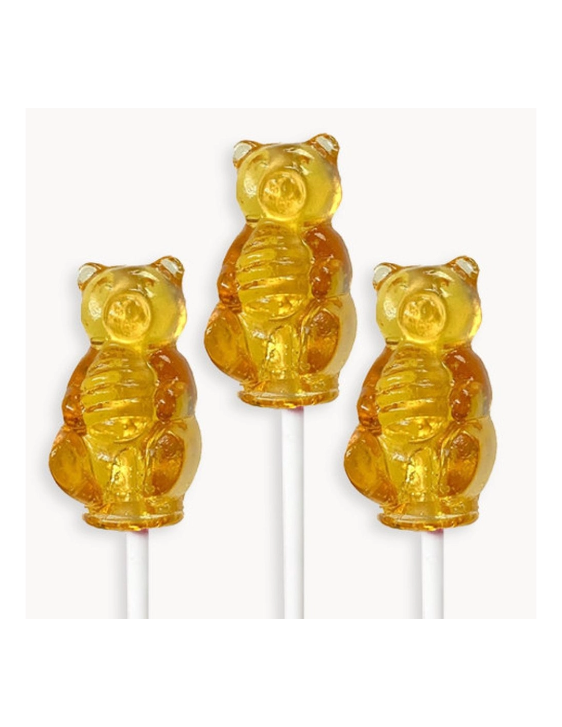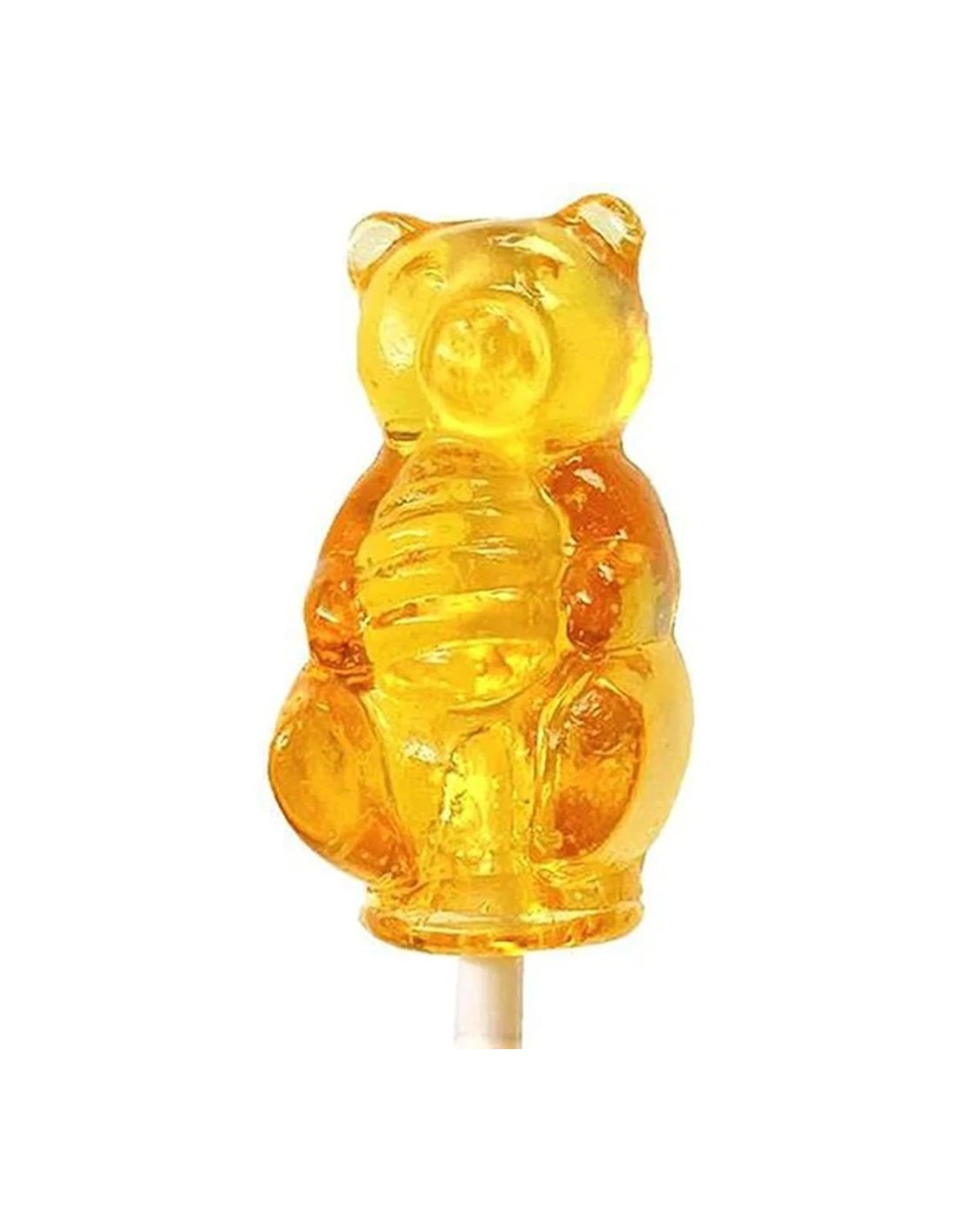 Con questa edizione speciale di Honey Bear Pops , scopri una caramella che rende un vibrante omaggio a una vera icona della cultura nordamericana: la famosa bottiglia di miele in plastica a forma di orsetto (l'"Honey Bear")! Realizzato in zucchero cotto traslucido e attaccato a un bastoncino, questo lecca-lecca riproduce fedelmente la forma di questo simpatico orsetto, impreziosito da uno splendido colore ambrato luminoso.