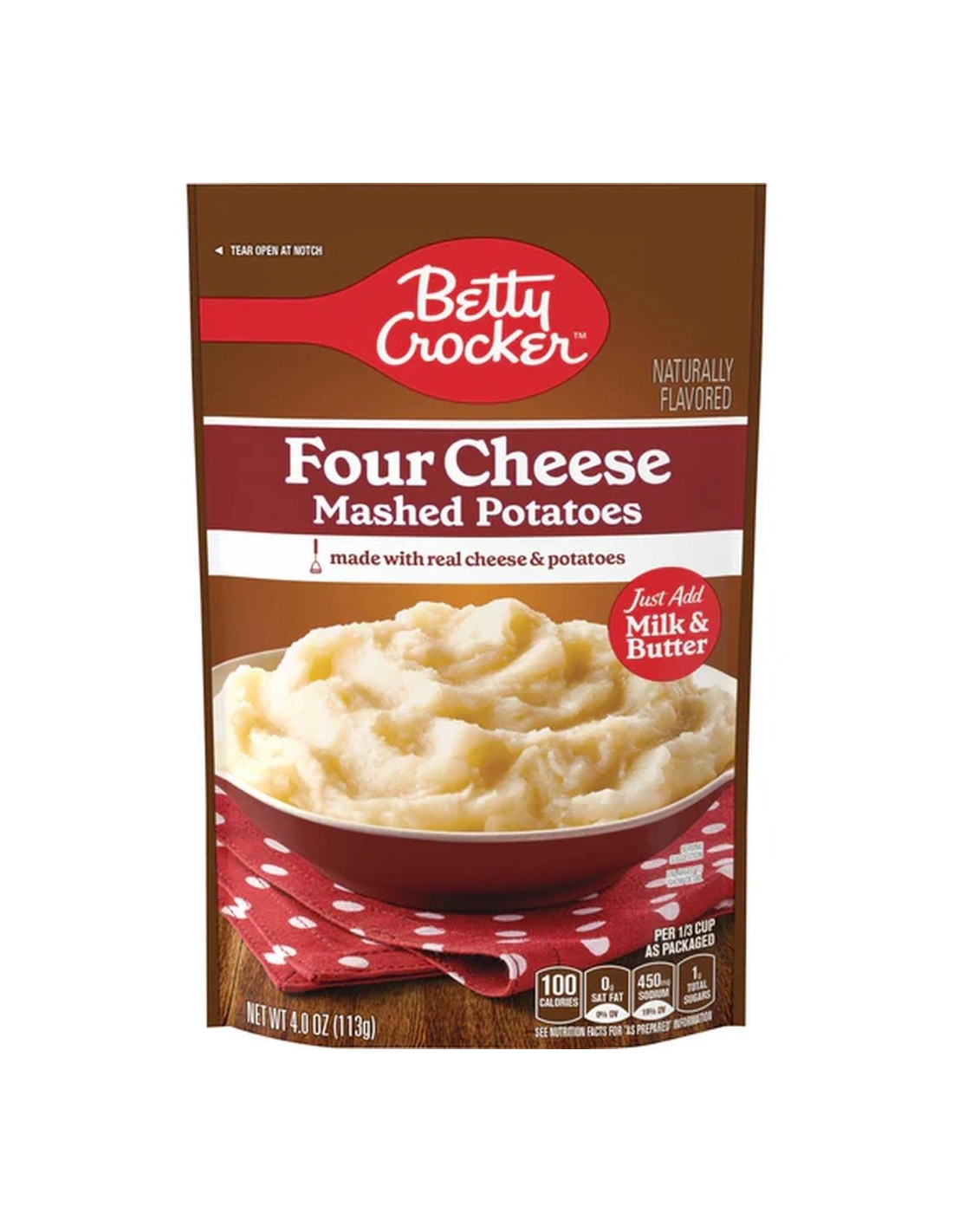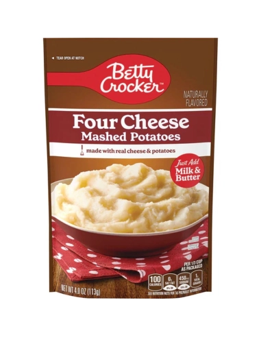 Scopri il purè di patate ai quattro formaggi Betty Crocker (113 g) : il purè di patate preferito dai buongustai! Un contorno cremoso e saporito, che unisce patate che si sciolgono in bocca a una deliziosa miscela di 4 formaggi .