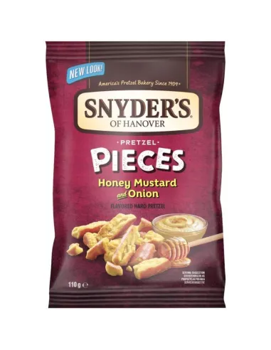 I pezzi di pretzel Snyder's Honey, Mustard & Onion rappresentano uno degli snack salati più iconici degli Stati Uniti. Prodotti da Snyder's of Hanover , marchio fondato in Pennsylvania e pioniere del pretzel americano, questi pezzi di pretzel spezzati sono conditi con un'irresistibile miscela di miele dolce, senape piccante e cipolla profumata .