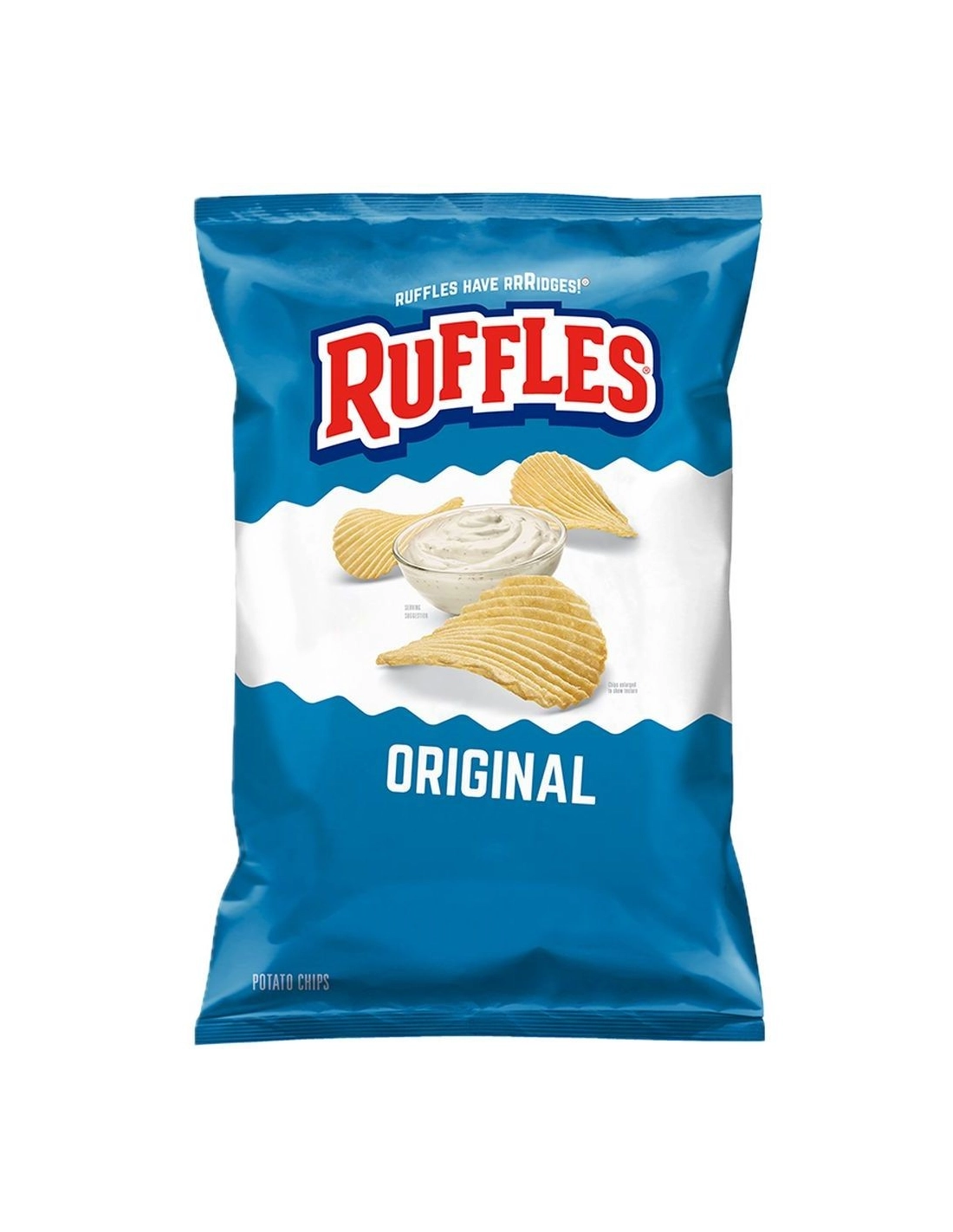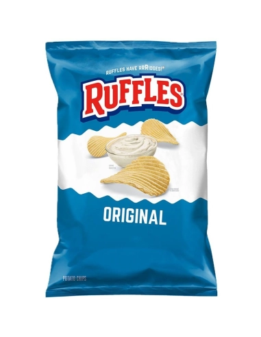 Scopri le Ruffles Original Chips (184 g) : le star dell'antipasto americano! Patatine semplici, leggermente salate, spesse e fortemente ondulate , tagliate su misura per resistere anche alle salse più dense senza mai rompersi.