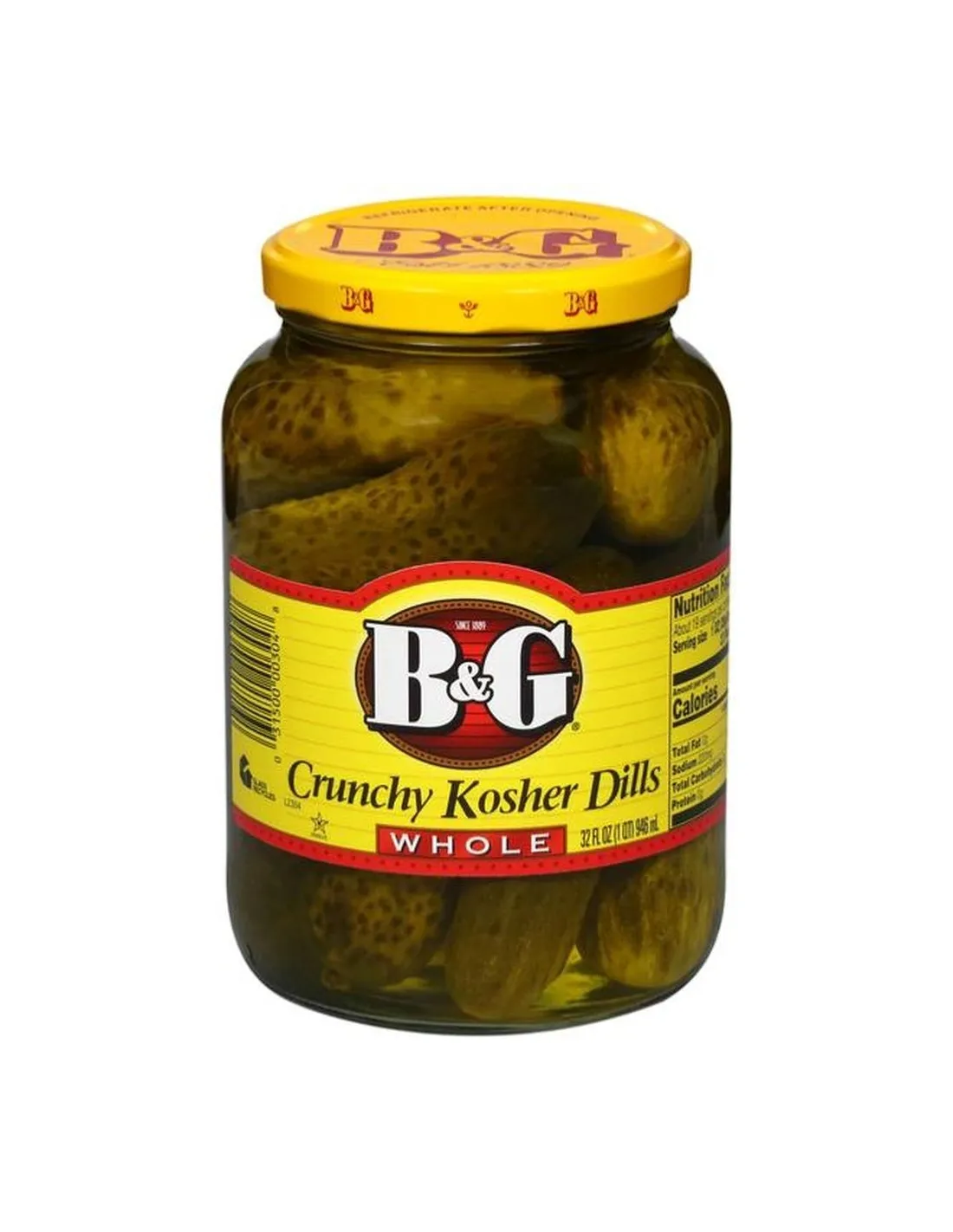 I sottaceti interi Kosher Dill Whole di B&G sono cetriolini americani interi , marinati con aneto secondo una tradizionale ricetta kosher . La loro forma intera, non tagliata , la consistenza croccante e il classico sapore aspro li rendono i cetriolini americani per eccellenza. Vasetto capiente da 946 ml .