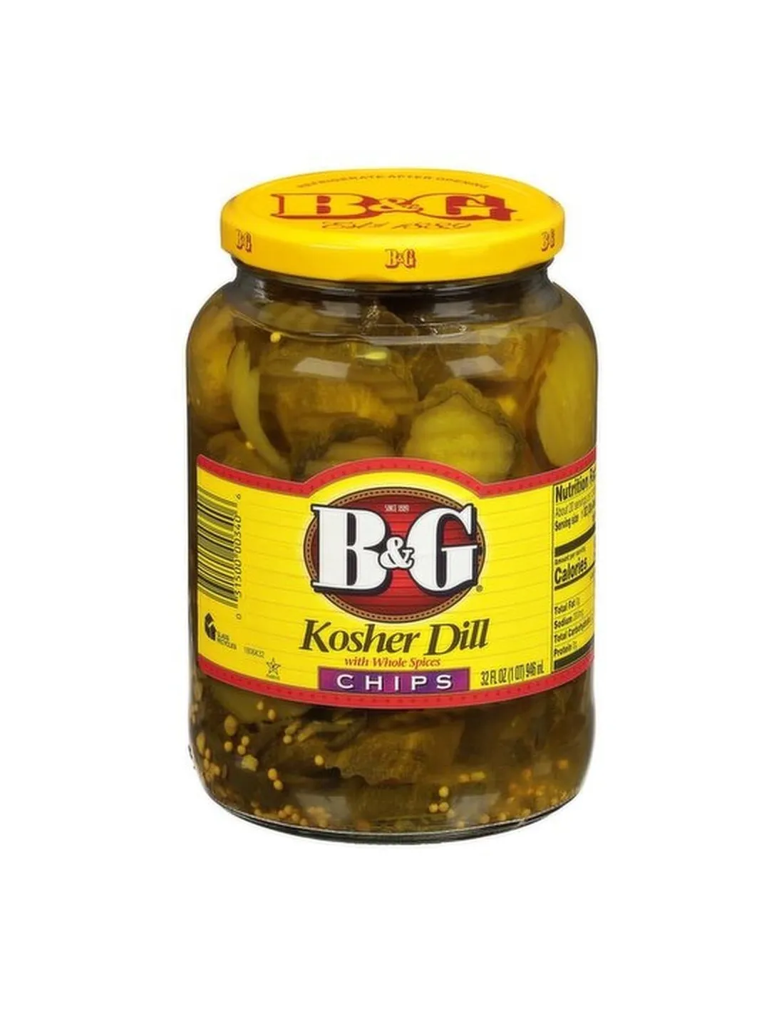 Informazioni sul marchio B&G : Fondata nel 1889 a New York City , B&G Foods (Bloch & Guggenheimer) è un'istituzione americana nel settore dei sottaceti da oltre 130 anni. Il suo prodotto di punta è la linea Kosher Dill , preparata secondo i requisiti kosher che garantiscono ingredienti di qualità e un rigoroso processo di produzione. Il formato Chips (anelli) è il più popolare negli Stati Uniti per guarnire gli hamburger, soddisfacendo la praticità ricercata dagli amanti del cibo americano che desiderano un sottaceto perfetto senza la seccatura di tagliarlo.