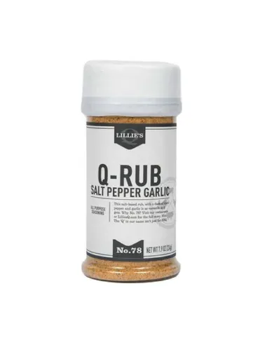 Lillie's Q Q-Rub Salt Pepper Garlic è un condimento per barbecue americano creato da un due volte campione del mondo di barbecue . Questa versatile miscela, a base di sale marino , pepe nero e aglio, esalta tutte le carni con la semplicità e l'efficacia dei migliori pitmaster.