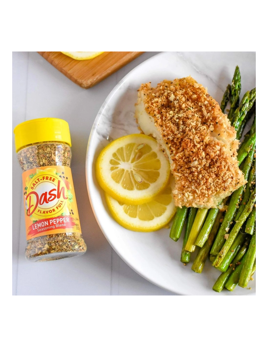 Scopri Dash Lemon Pepper Seasoning Blend : la famosa miscela di spezie americana senza sale che unisce la freschezza del limone al sapore piccante del pepe nero per dare un tocco di vivacità a tutti i tuoi piatti!