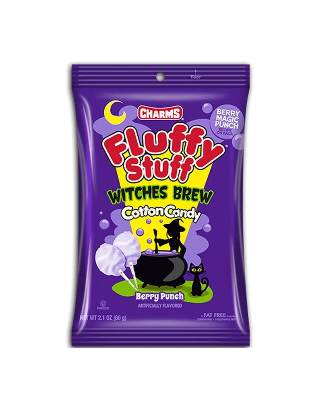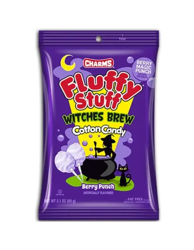 Lasciatevi conquistare dallo zucchero filato Fluffy Stuff Witches Brew , prodotto negli USA . Deliziosamente fruttato con il suo sapore Berry Punch , questo zucchero filato è completamente bianco, proprio come il colore di una ragnatela. In un solo morso, vi scioglierete di piacere! Charms ci offre una versione limitata da 60 g per gli amanti di Halloween.