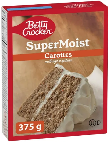 La préparation pour gâteaux Betty Crocker Super Moist Carrot Cake Mix est très simple à réaliser. Facile à utiliser, elle vous permet de réaliser de magnifiques gâteaux moelleux à la carotte pour une fête réussie ! Toutes les indications sont présentes au dos de la boîte, il vous suffira d'ajouter de l'eau ou du lait, de l'huile végétale et des oeufs. Vous pourrez compléter votre gâteau avec une crème de glaçage Betty Crocker ou de la confiture.