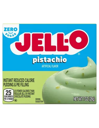 Le Jell-O Instant Pudding & Pie Filling Pistachio Zero Sugar est une préparation instantanée qui offre une alternative allégée au pudding pistache classique. En mélangeant simplement la poudre avec du lait froid, la crème épaissit rapidement pour atteindre une texture lisse, ferme et onctueuse. Le goût pistache reste présent et doux, tout en étant moins sucré, ce qui permet d’obtenir un dessert plus léger sans sacrifier la saveur.