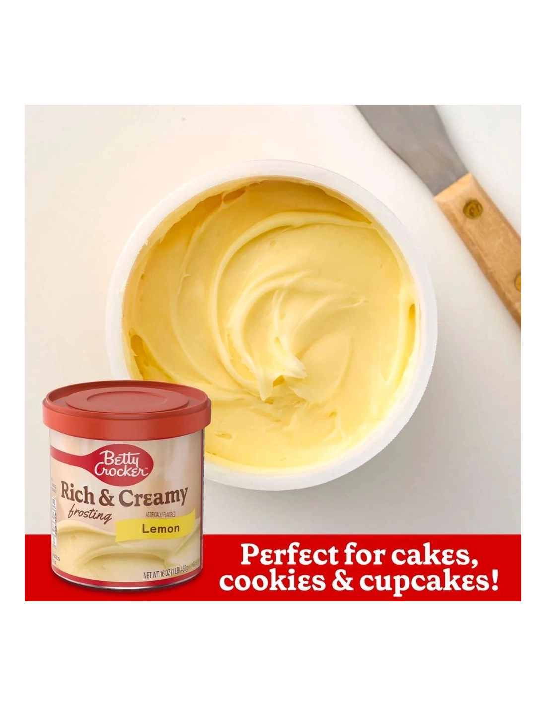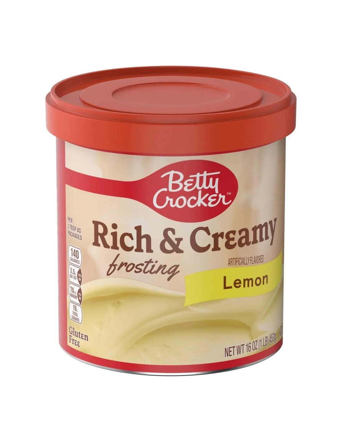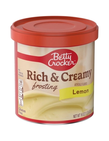 Le Betty Crocker Rich & Creamy Frosting Lemon est un délicieux glaçage à la vanille sans gluten, parfait pour les gâteaux, cupcakes et biscuits. Rapide et facile : il suffit d'ouvrir la boîte, d'étaler le glaçage et de profiter ensuite de vos préparations. Vous pouvez aller sur le site de Betty Crocker et découvrir une multitude de recettes pour vous donner des idées.