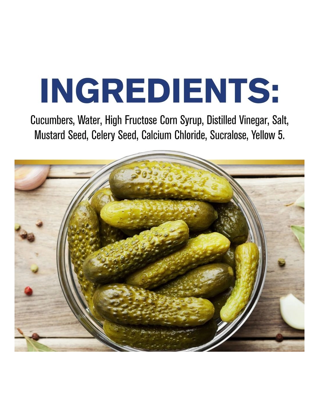 Concombres, eau, sirop de maïs à haute teneur en fructose, vinaigre distillé, contient 2 % ou moins de : sel, extrait de curcuma (colorant), épices, graines de céleri, chlorure de calcium, sucralose.