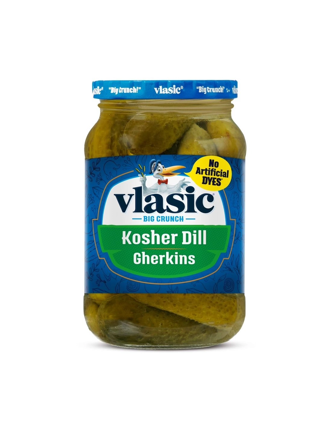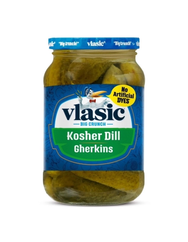 Plongez dans la tradition des célèbres delicatessens américains avec les Vlasic Kosher Dill Gherkins ! La mythique marque à la cigogne, véritable institution aux États-Unis, vous propose ici ses célèbres "baby pickles" (petits cornichons) préparés selon l'incontournable recette "Kosher Dill".
