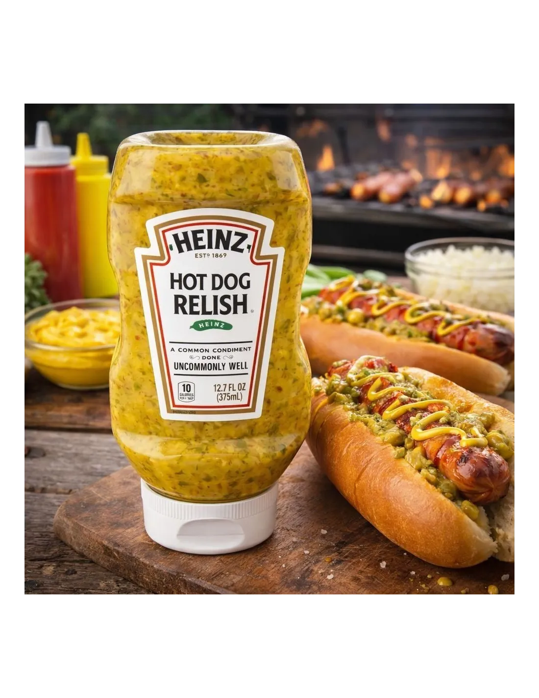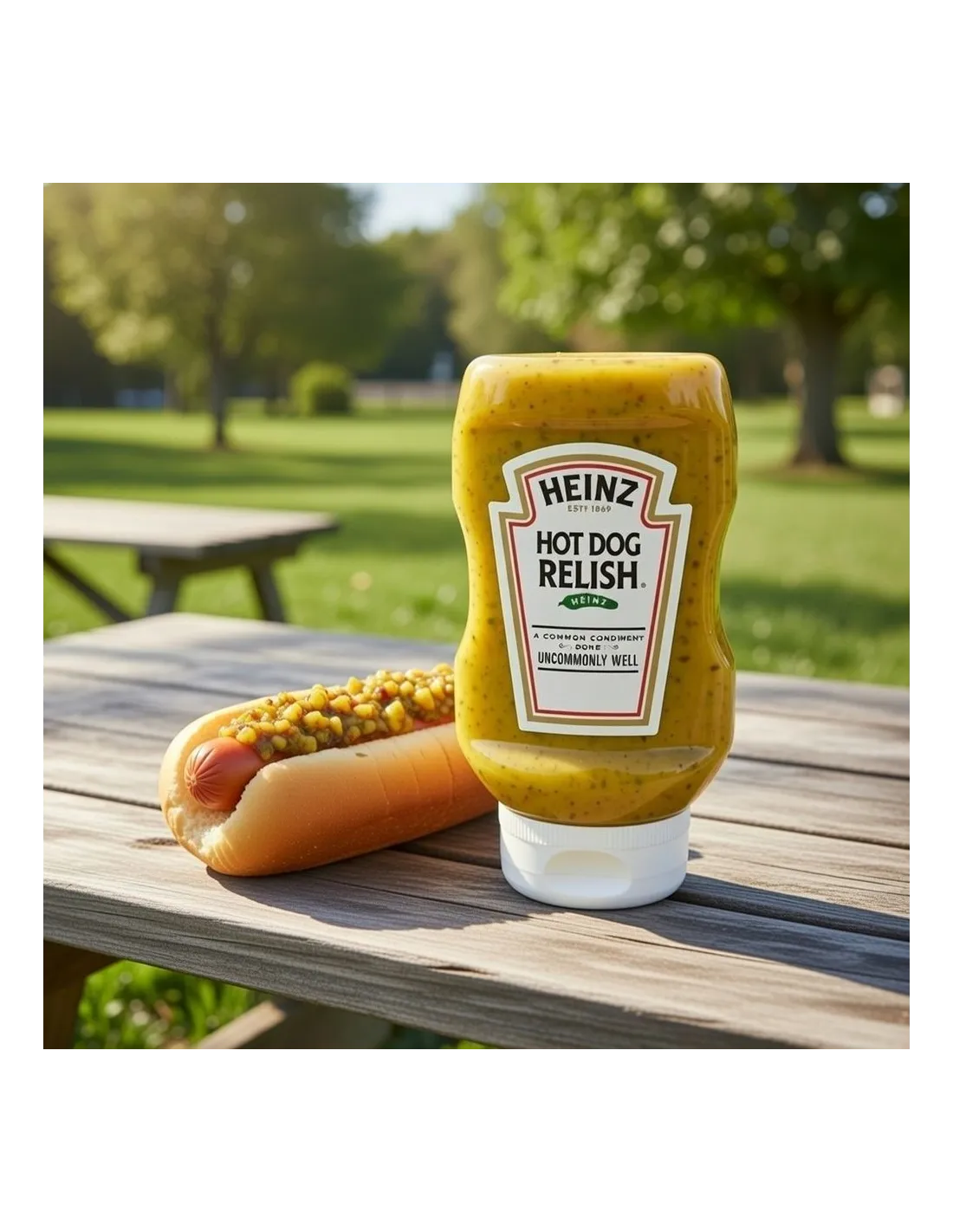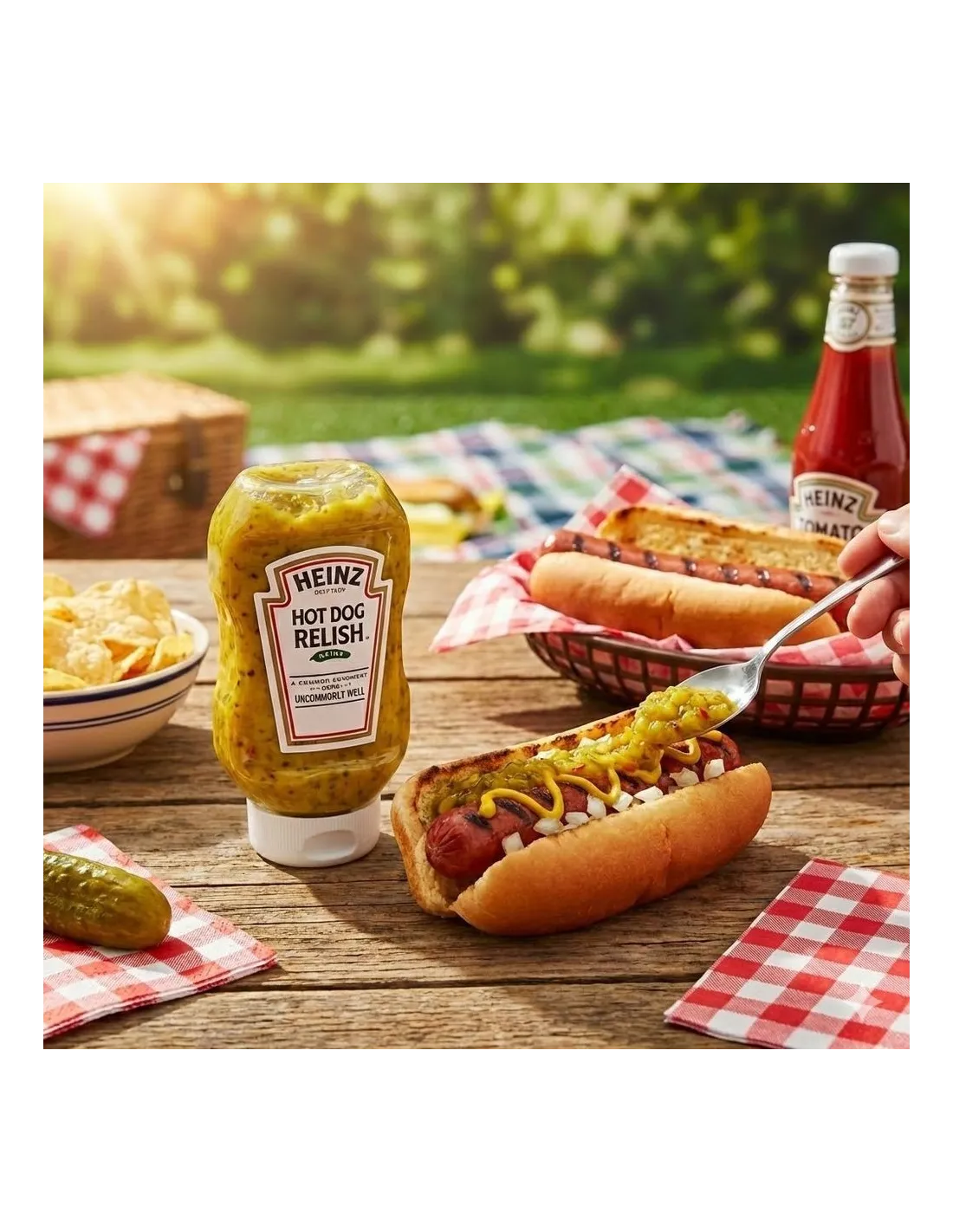 Heinz Hot Dog Relish est le condiment signature des hot-dogs à l'américaine. Ce mélange sucré-épicé combine cornichons croquants, chou mariné et moutarde jaune, relevé de curcuma, graines de moutarde et oignons. Sa couleur jaune doré caractéristique et son goût unique en font l'accompagnement incontournable des stands de hot-dogs aux États-Unis. Bouteille squeeze pratique de 375ml pour un dosage parfait.