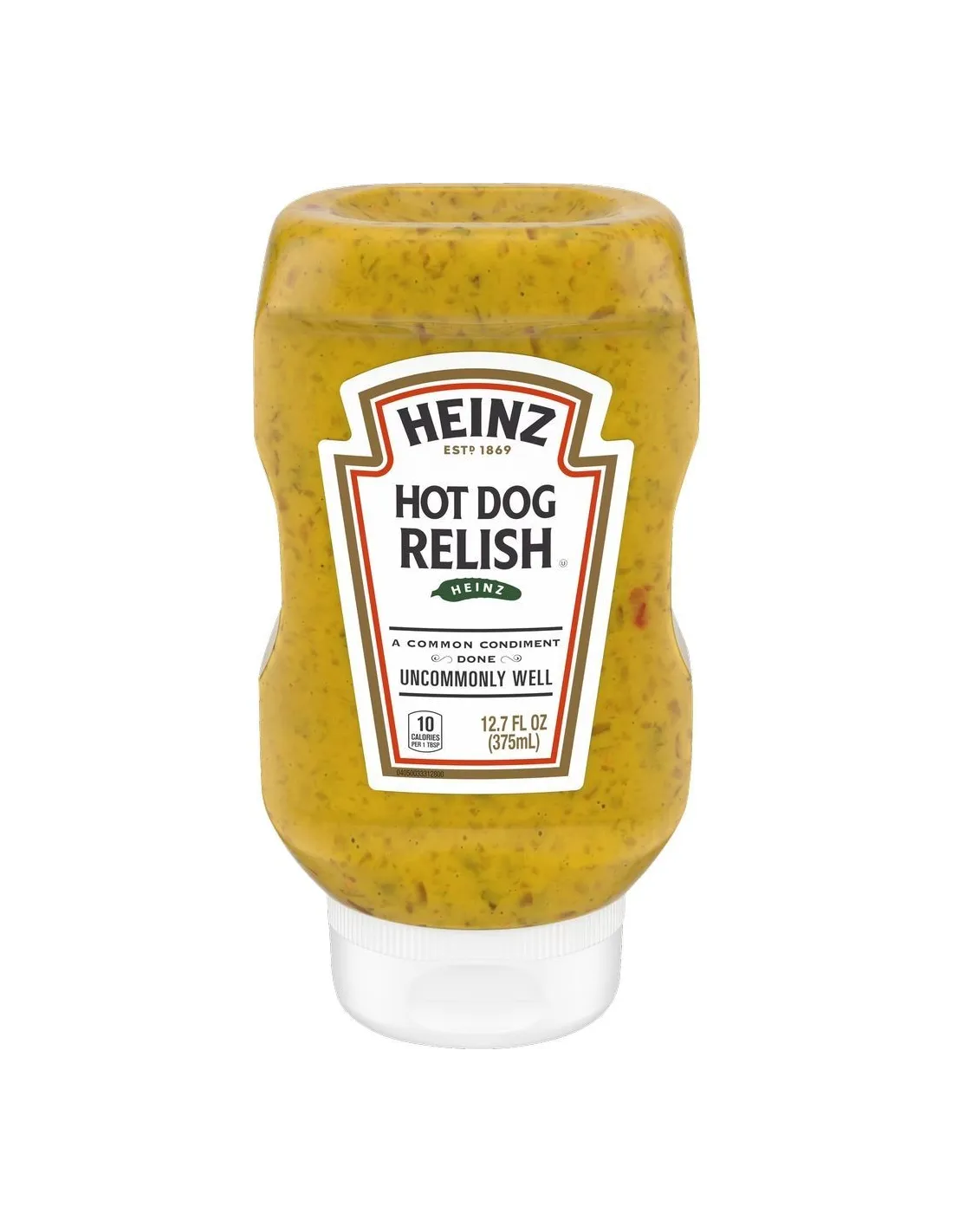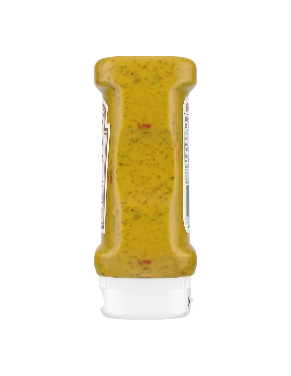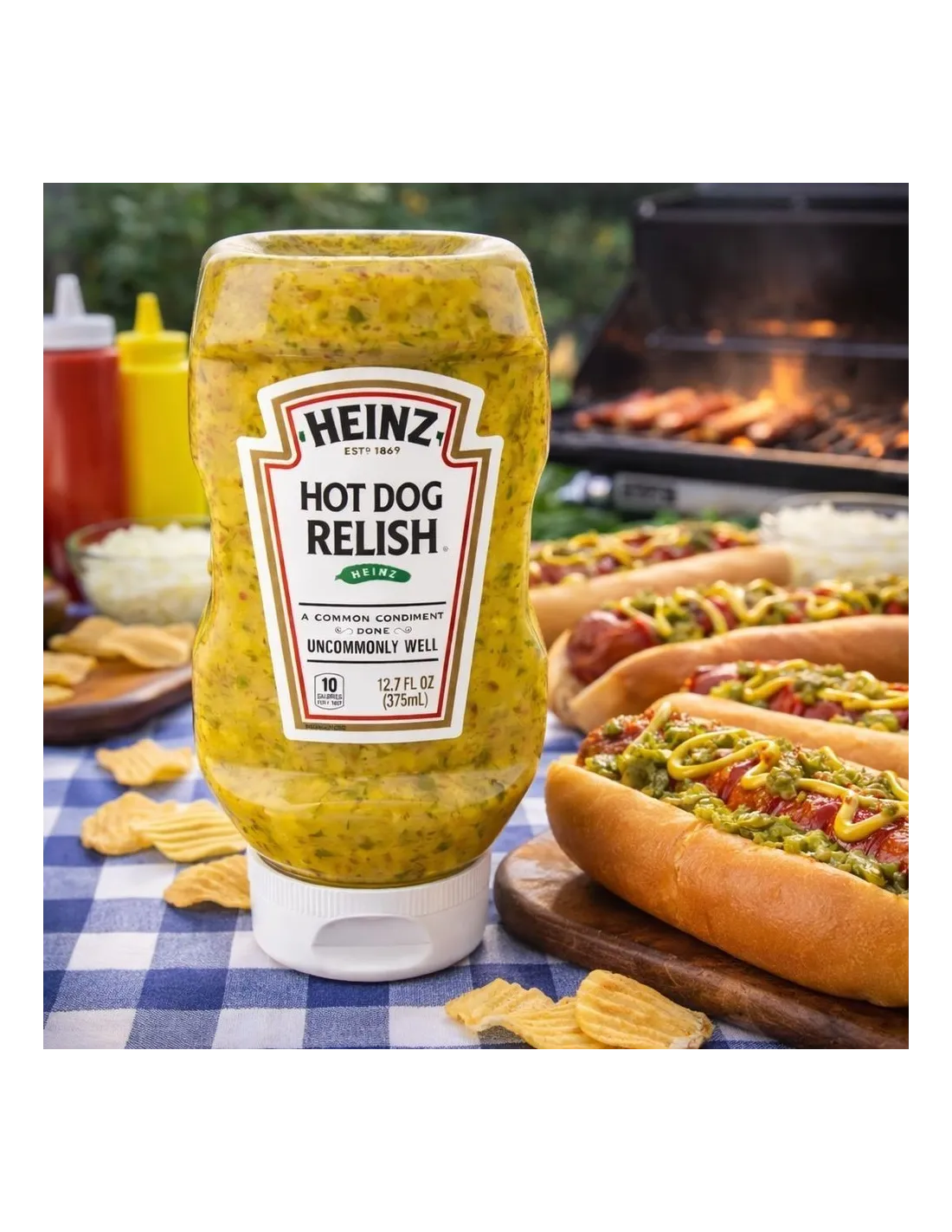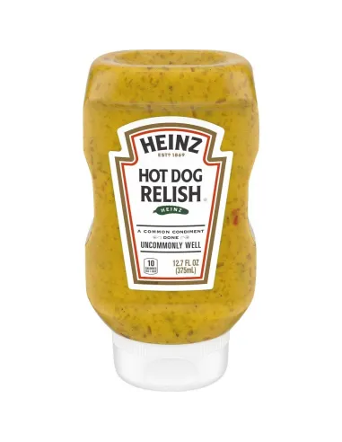 Heinz Hot Dog Relish est le condiment signature des hot-dogs à l'américaine. Ce mélange sucré-épicé combine cornichons croquants, chou mariné et moutarde jaune, relevé de curcuma, graines de moutarde et oignons. Sa couleur jaune doré caractéristique et son goût unique en font l'accompagnement incontournable des stands de hot-dogs aux États-Unis. Bouteille squeeze pratique de 375ml pour un dosage parfait.