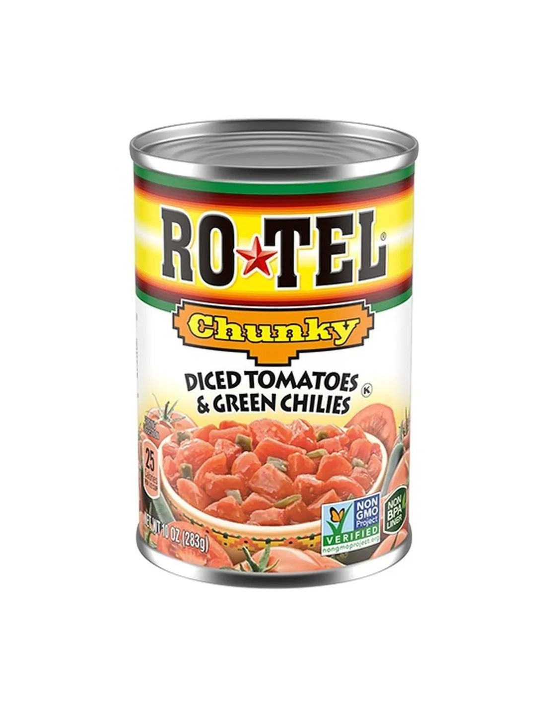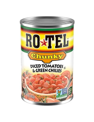 Ro-Tel Chunky Diced Tomatoes & Green Chilies est la version à gros morceaux de la légendaire recette texane créée en 1943. Des tomates mûries sur vigne en dés généreux, des piments verts hachés relevés et un mélange d'épices secrètes incluant de la coriandre fraîche. Cette version Chunky offre une texture plus rustique et une présence visuelle idéale pour les plats où les tomates doivent se voir. L'ingrédient secret des queso dips, chilis et recettes Tex-Mex authentiques. Non-GMO Project Verified.