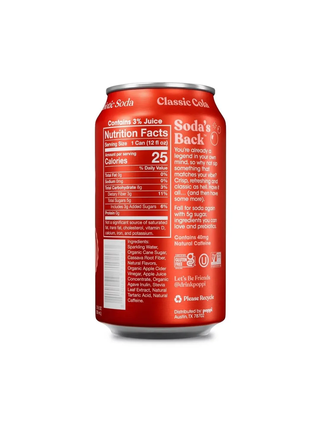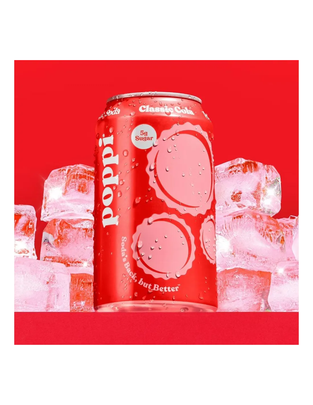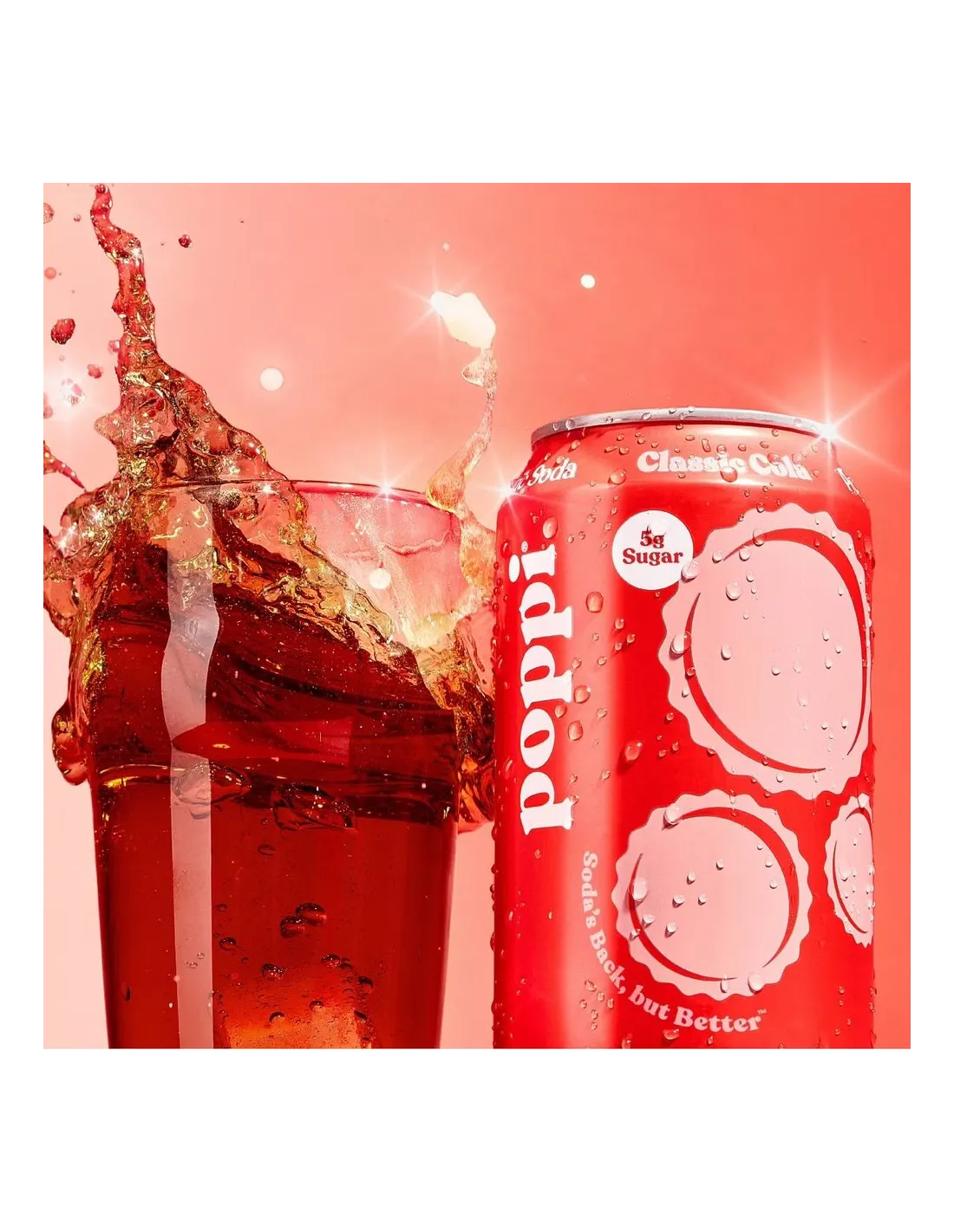 Le Poppi Prebiotic Soda Classic Cola réinvente l’un des sodas les plus iconiques au monde, en l’adaptant aux tendances bien-être et wellness venues des États-Unis. Poppi propose ici un cola plus léger, moins sucré, pétillant juste comme il faut, et enrichi en prébiotiques naturels issus du vinaigre de cidre pour favoriser une digestion plus harmonieuse. Une vision moderne du cola, fun et rafraîchissante.