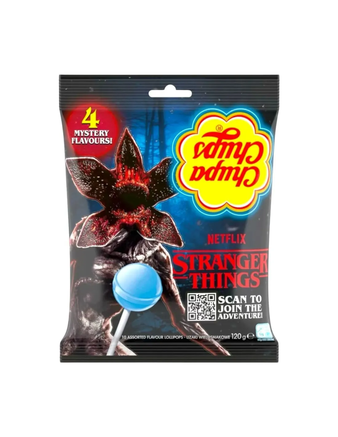 L’édition limitée Chupa Chups x Stranger Things « Upside Down » propose un sachet de 10 sucettes aux 4 goûts fruités : cerise, framboise, cola, cerise acidulée.