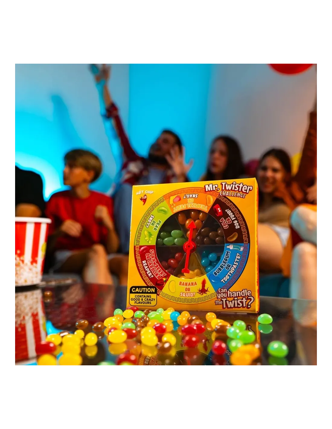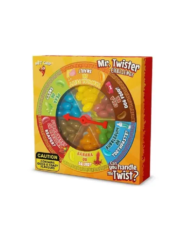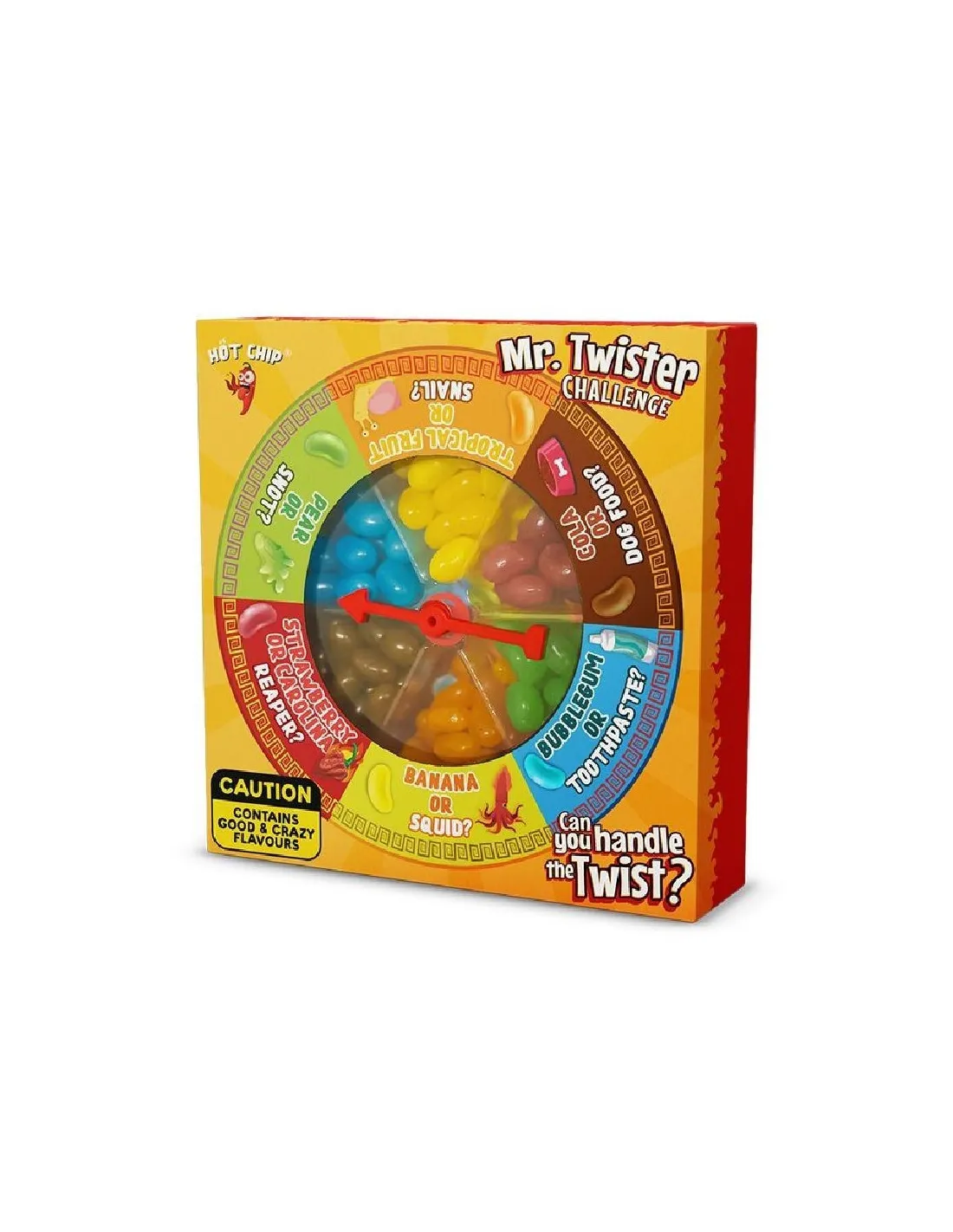 Le Hot Chip Mr. Twister Challenge est un jeu de bonbons roulette aux saveurs imprévisibles. Tournez la roue et découvrez si vous dégusterez une douceur sucrée ou une surprise audacieuse : fraise, cola, banane... ou Carolina Reaper, calamar, et pire encore. Oserez-vous relever le défi ?